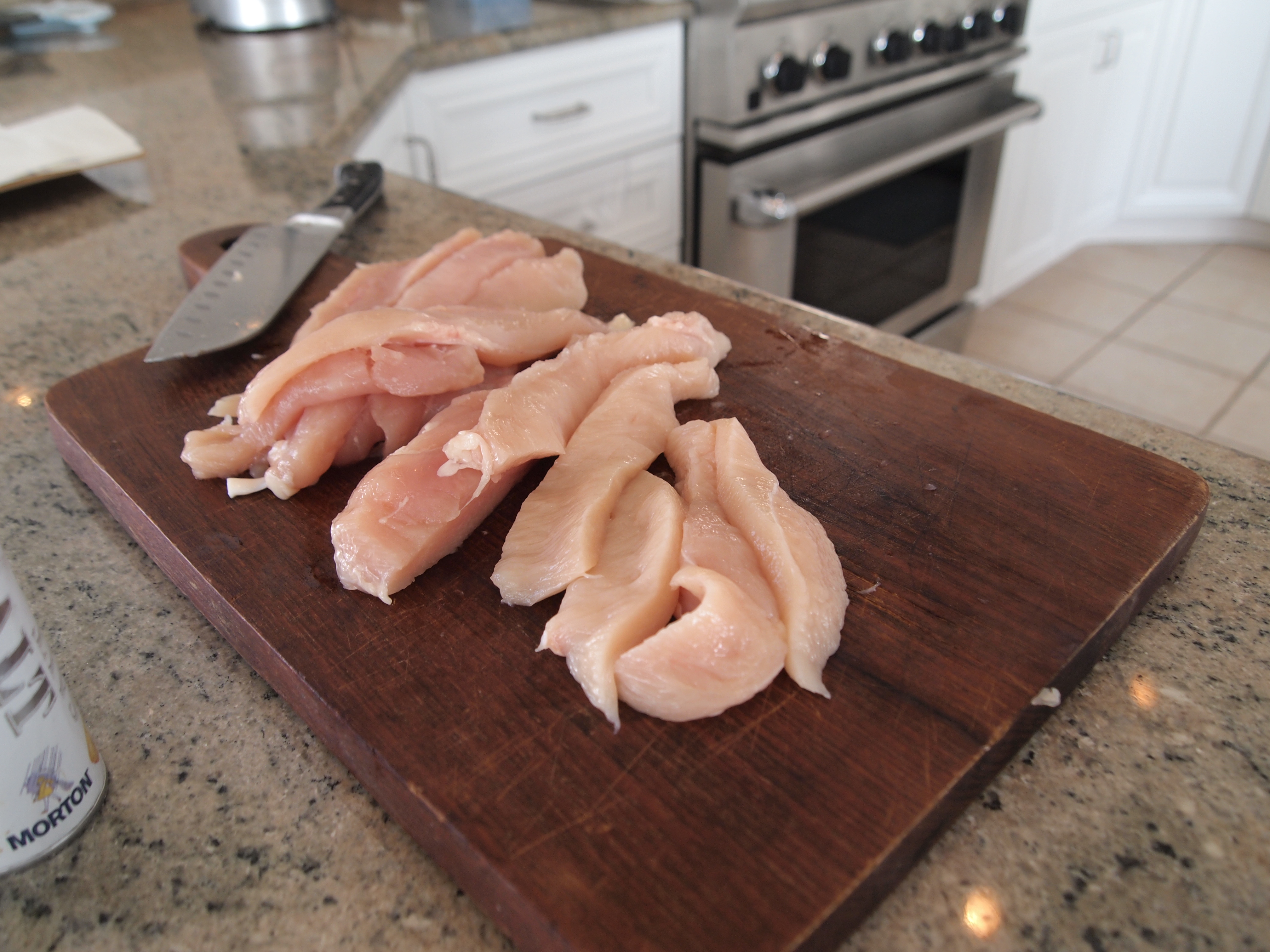 Butterfly each chicken breast and cut into long 1 inch wide strips. Brine the chicken if you would like in a bowl of cold water and salt, pat dry.